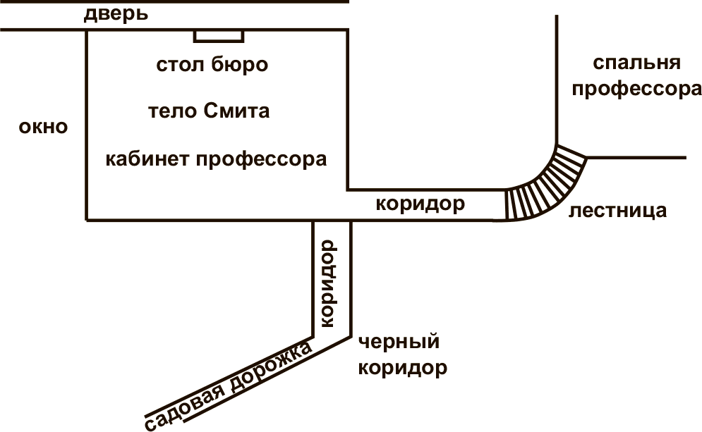 – Это, конечно же, грубый набросок, я изобразил только те места, которые, как мне кажется, могут иметь отношение к делу. Все остальное вы позже сами увидите. Итак, во-первых, если предположить, что убийца проник в дом с улицы, как он (или она) это сделал? Несомненно, прошел по садовой дорожке и вошел в дом через черный ход, откуда открывается прямой доступ к кабинету. С другой стороны попасть туда было бы весьма затруднительно. Покинул дом убийца, скорее всего, тем же путем, что и вошел, потому что оба других выхода из кабинета были перекрыты: по одному шла Сьюзен, спускавшаяся по лестнице, другой ведет прямо в спальню профессора. Поэтому я сразу же осмотрел садовую дорожку, которая после дождя размокла, и на ней наверняка должны были остаться следы.