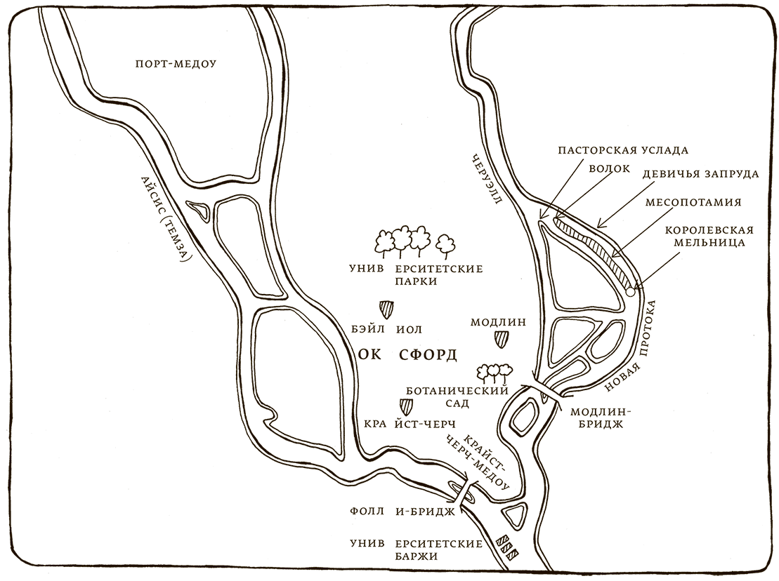 Катание на лодках — самый напряженный оксфордский спорт и самый безмятежный отдых. В теплое время года можно неспешно плавать на плоскодонке, бесконечно тренироваться на спортивной восьмерке или «…быстро скользить на каноэ под стенами Модлина и плыть по извилистому руслу к Королевской мельнице у Месопотамии, а оттуда к Пасторской усладе и потом обратно — голова отдохнула, мышцы натружены и напряжены».