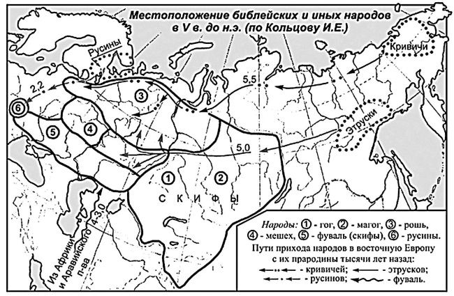 От названных пророком Иезекиилем древних народов (государств) «Рошь» на территории современной России сохранилось название народа и самой страны. От «Мешех» сохранилось название местности «Мещерская низменность» (Мещера). Здесь употреблялся удмуртский язык. Народ ушел к Каме. От государства Фуваль, располагавшемся в Северном Причерноморье и Прикаспии, название территории не сохранилось, хотя в этих местах проживали скифы, которые были описаны Геродотом в V в. до н. э. (см. рис. 22).