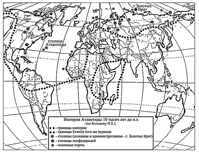 Легенды Востока сообщают, что остров Атлантида находится в средней части Атлантического (Эфиопского) океана, на котором неоднократно возникали и гибли цивилизации. После каждой катастрофы остров уменьшался в размерах, а при последней, третьей катастрофе, он ушел под воду. После гибели острова Атлантида, обширные территории империи не погибли. Продолжали свое функционирование административная столица на Таймыре и многие конфедерации.