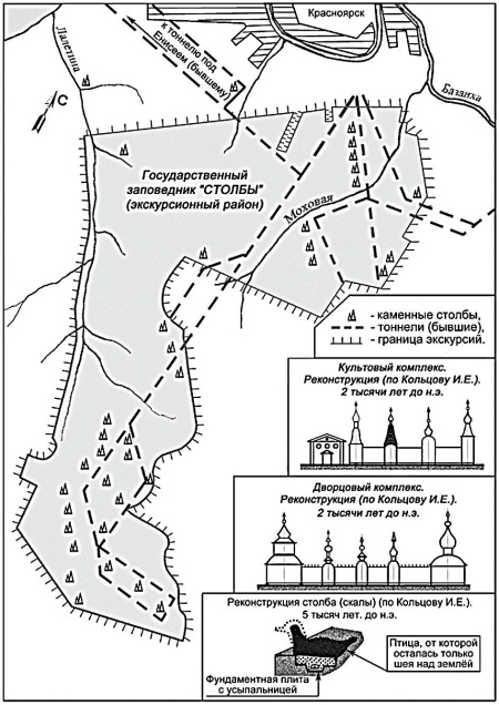 Одним из наиболее доступных для посещения и осмотра многочисленных древних памятников того времени являются Красноярские столбы, южнее г. Красноярск. Они появились здесь в VIII–II тысячелетиях до н. э. Здесь было много усыпальниц, которые соединялись с централизованной системой тоннелей. Это был культовый «город мертвых». Потомки народов, ушедших отсюда, сейчас живут на Дальнем Востоке, в Японии, на юго-востоке Азии, в Иране, Афганистане, Осетии и т. д. Здесь были изваяния сфинксов, птиц и другой фауны. Здесь находились комплексы культовых сооружений из камня, напоминающие своей формой тибето-буддийскую архитектуру со своими подземными строениями. В результате неоднократных землетрясений многое сверху оказалось разрушенным. Изменился и рельеф местности (см. рис. 47).