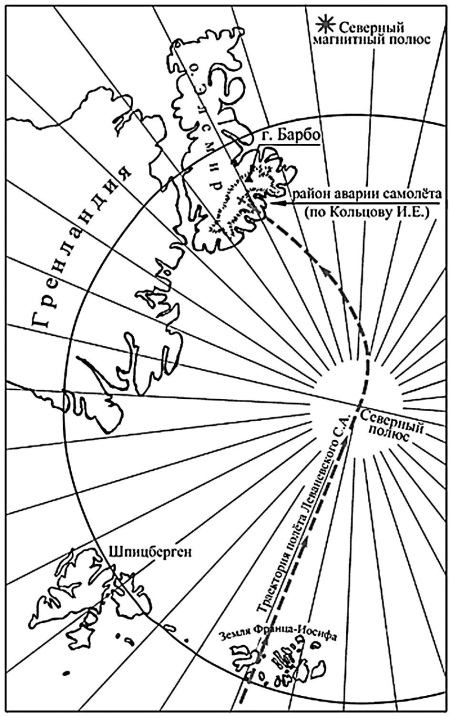 Для определения полета Н-209 предположили, что его маршрут от Москвы до места аварии должен быть отражен в ноосферных слоях Земли. Эта траектория полета реально проявилась на глобусе (карте) в виде особой тонкой вибрирующей линии. Эта линия искрилась взором глаз Леваневского и улавливалась биолокационным способом. Таким методом была выявлена как трасса полета, так и место его аварии на леднике хребта Юнейтед-Стейкс острова Элсмир. Биолокацией фиксируются останки самолета, людей, наличие там алюминия, железа и других материалов. Предположительно самолет лежит на боку и находится у самой поверхности ледника под тонким слоем снега. Эти сведения проверяемы опытными специалистами, владеющими биолокацией (см. рис. 58).