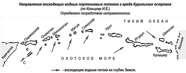 Эта неизвестность побудила коллектив энтузиастов провести на общественных началах независимое многолетнее исследование всей группы Курильских островов на наличие в них полезных ископаемых. При исследованиях были приняты во внимание и использованы имевшиеся сведения о наличии в недрах земли удивительных водных потоков, которые своеобразной сетью охватывают всю нашу планету. Местами от этой сети отходят восходящие потоки, которые выносят на поверхность земли различные ценные минералы, откладывая их в пластах пород. Для выявления восходящих потоков использовался приборный метод интрагеоскопии. В результате исследований было выявлено, что к ряду Курильских островов подходят восходящие водные потоки с отложениями ценных полезных ископаемых, как со стороны Охотского моря, так и Тихого океана (см. рис. 59).