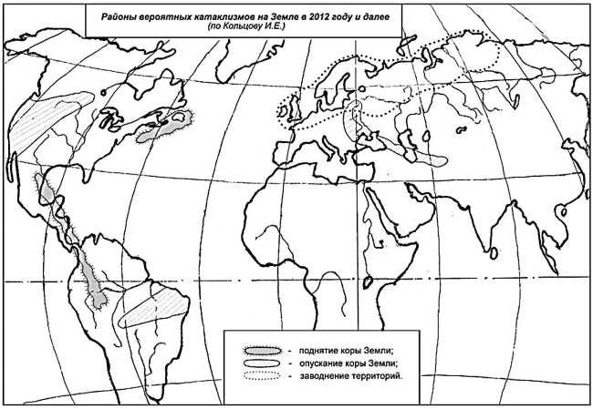 Не исключено, что период нового цикла больших природных потрясений на Земле уже наступает. Его предвестниками являются прошедшие крупные землетрясения в Туркмении (1948 г.), Узбекистане (70-е годы), Армении (80-е), которые находятся в сейсмоактивной зоне, простирающейся от Прибалтики до Памира и Тянь-Шаня и проходящей через Крым и Западный Кавказ. Периодические потрясения земель в этой сейсмоактивной полосе за последние тысячелетия известны современным ученым, в том числе и из летописных источников. Возможны заводнения (заболачивания) северных областей Европы и Азии от Франции до реки Лены, а также Бразильского плоскогорья и запада США (см. рис. 60). Об этом свидетельствуют аномальные процессы с обильными осадками в виде воды и снега в Европе и Америке.