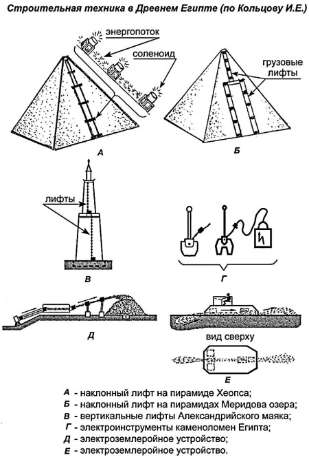 Древнегреческий историк Геродот в V в. до н. э. писал, что в Египте многое сравнимо с чудом. Кроме пирамид Хеопса, Хефрена и Микерина в Гизе имеются две гигантские пирамиды посреди Меридова озера (в 100 км юго-западнее Каира). До наших дней эти пирамиды не сохранились. Еще одним чудом того времени являлось огромное сооружение Лабиринта, который находился недалеко от Нила. Это сооружение было сокровищницей ценностей и знаний фараонов. Лабиринт был сооружен в виде исполинской подковы, имея по 1500 комнат в наземной и подземной части. Это грандиозное строение тоже не сохранилось. Все эти гигантские сооружения возводились посредством инженерно-технических устройств, в основе которых было использование источников статического электричества. Например, при строительстве пирамиды Хеопса был применен наклонный грузоподъемный лифт, в котором использовались соосно установленные с определенным шагом спаренные электромагниты и соленоиды (см. рис. 61). Оборудование наклонного лифта было изготовлено на Алтае, где также находятся пирамиды значительно б'oльшего размера, чем египетские. В то время технические устройства с использованием электричества применялись во многих направлениях, в том числе и в каменоломнях, в освещении подземных и надземных помещений.