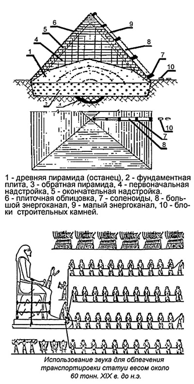 Для египтологов до сих пор остается нерешенным вопрос о методе возведения пирамиды и подъема каменных блоков на высоту до 150 метров. Люди, способные видеть прошлое (ясновидцы), сообщают, что камни сами летели вверх по особому энергетическому каналу. Этот энергоканал был создан строителями посредством технических устройств посредине восточной стороны пирамиды (со стороны Нила). Исследования показали, что многотонные каменные блоки, доставлявшиеся к подножию пирамиды, подвергались энергообработке генераторами для ослабления их гравитационного взаимодействия с землей и увеличения взаимодействия с каналом энергопотока вверх вдоль пирамиды. После этого блоки посредством канатно-блочного кантователя подавались в приемник энергоканала и летели вверх к месту укладки. Энергетический поток канала создавался своеобразными соленоидами-трансформаторами, установленными на одной оси вдоль стены пирамиды. По мере роста высоты пирамиды удлинялось (наращивалось) устройство, создававшее энергоканал.