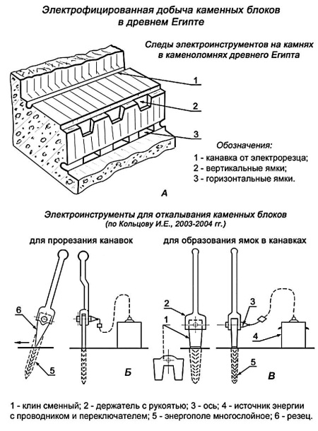 В наши дни можно видеть в египетских каменоломнях, в местах отлома камней, многочисленные углубления трапециевидной формы, явно не ручной работы (см. рис. 74А). Оказывается, что откалывание камней установленных размеров велось с применением электроинструментов, где к их рабочей режущей части подводился определенного вида электрический ток. При этом перед режущей рабочей частью возникал многослойный энергопоток (облачко), который ослаблял в его зоне связь между частицами и кристаллами камня, что позволяло инструменту внедряться в камень, как в масло при небольшом усилии рабочего.