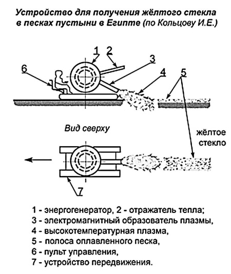 Появление ЖС приходится на период образования более 7 тыс. лет назад песчаных пустынь в северной Африке, исчезновения лесов и появления здесь новых народов. Для строительства храмов, дворцов и иных строений необходимо было также и стекло, для доступа света внутрь помещений. Решение было найдено специалистами этих народов. Используя принцип плавки металлов, они создали устройство для плавки песка высокотемпературной плазмой, которое можно видеть на рисунке 75. Это устройство состояло из энергогенератора статического электричества и электромагнита, помещенных на передвижной платформе. При работе из нижнего конца электромагнита вырывается факел высокотемпературной плазмы (до 4000–5000oС). При движении работающего устройства за ним остается полоса расплавленного песка с желтым стеклом. В расплаве могут находиться и другие включения. Эта полоса расплава могла резаться и колоться на определенные размеры для использования в строительстве.
