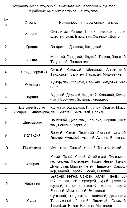 Необходимо отметить, что на севере Англии около 5 тыс. лет назад появился народ, родственный этрускам, пришедший из Гренландии через Исландию. Из Англии он попал в Скандинавию, Данию, Европу. В преданиях Литвы говорится, что около 3 тыс. лет назад в Прибалтику с Адриатического моря (Иллирии) прибыли три этрусских князя с людьми. Они основали город Каунас, Вильнюс, Тракай и другие населенные пункты, которые имеют до сих пор этрусские названия. Этрусские наименования населенных пунктов можно встретить в районах их длительного проживания: в бассейне рек Алдан и Индигирка, Румынии, Албании, Греции, Турции, Италии, Венгрии, Швейцарии, Ливии и т. д. По земле неоднократно прокатывались кампании переименования древних названий населенных пунктов на новые. Но все же кое-где сохранились этрусские названия в целом ряде стран. Эти страны и часть этрусских наименований населенных пунктов можно видеть в таблице.