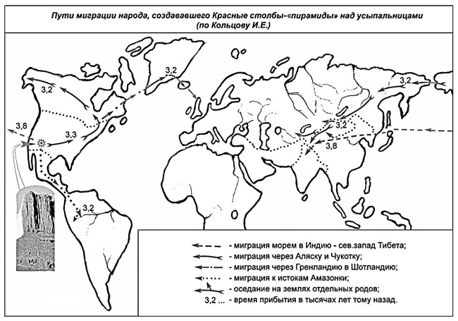 Около 4 тысяч лет назад отдельные роды народа начали покидать эти места. 3,8 тысячи лет назад часть народа ушла в западном направлении – на север Индии, переправившись через Тихий океан на самоходных кораблях вдоль многочисленных островов, существовавших тогда. Второй поток людей 3,3 тысячи лет назад ушел в северном направлении сухопутным путем через Аляску и Чукотку в район Джунгарии и северо-запада Тибета. У Великих озер Северной Америки отдельные роды отделились и ушли через Гренландию в Британскую Шотландию. Около 3,2 тысяч лет назад третий поток народа ушел в южном направлении к истокам реки Амазонки и Перу. Пути их миграции см. на рис. 89. Оставшаяся часть народа позднее ушла в северном направлении к истокам реки Миссури в Скалистые горы (штат Монтана).