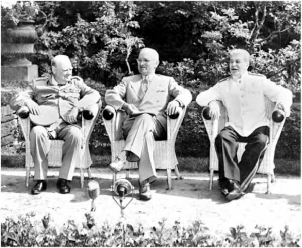 Уинстон Черчилль, Гарри Трумэн и Иосиф Сталин на Потсдамской конференции. 1945 г.