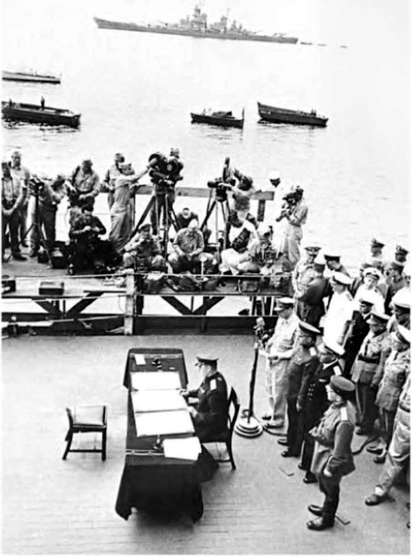 Представитель СССР генерал-лейтенант К.Н. Деревянко подписывает «Акт о капитуляции Японии» на борту американского линкора «Миссури». 2 сентября 1945 г.