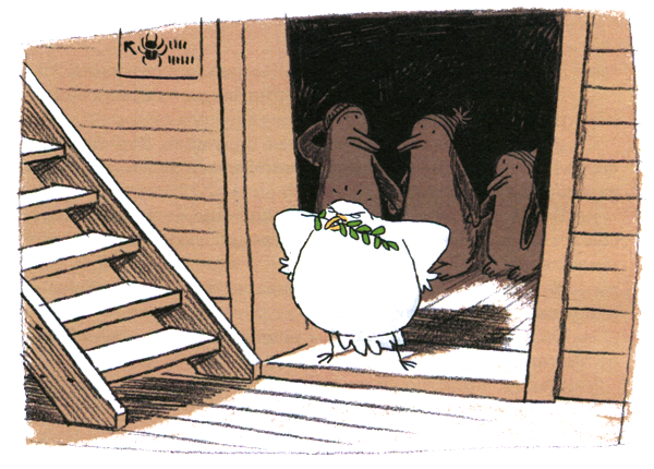 — Это оливковая ветвь, болваны, — вытащив ветку из клюва, сказала голубка. — Дождь кончился, и Ной попросил меня облететь всю округу, чтобы проверить, нет ли где земли. Вот что я нашла. Потоп прекратился, вода отступила, земля высохла. Ну, чего вы ждете? Выходите. На ковчеге уже никого не осталось. Вы опять последние. Даже черепахи вас опередили. Нечего тут копаться — стройтесь парами и марш с ковчега!
