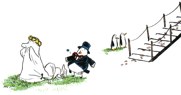 — Они познакомились на ковчеге, — пояснили пингвины. — Это была любовь с первого взгляда. С тех пор они все время держатся за руки, точнее за крылья. Поэтому в целях безопасности мы их поженили.