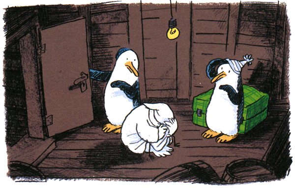 Если кто его и услышал, так это голубка. Стремительными шагами она спускалась в трюм. Первый пингвин едва успел прыгнуть в чемодан и захлопнуть за собой крышку. Еще чуть-чуть — и было бы поздно.
