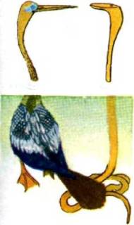 Когда анхинга, она же змеешейка, плывет, выставив из воды лишь длинную шею с маленькой головой, изгибая ее вправо-влево, то похожа на водяную змею. В воду птица погружается тихо и бесшумно, ныряет без броска и всплеска. Рыбу не распугивает. Подплывает незаметно и, пружиной разгибая длинную шею, пронзает рыбу клювом, как кинжалом. Хватает ее мелко зазубренным клювом и всплывает. Кидает рыбу вверх и снова ловит в раскрытый клюв, рыба вниз головой входит в птичью глотку.
