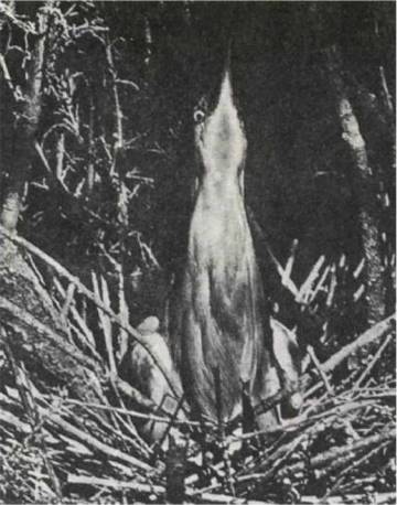 Загнанная, что называется, в угол выпь устрашает как филин-пугач. Распушенная; припадает к земле: полусогнутые крылья раскинуты, шея и перья на ней вздуты «колоколом».