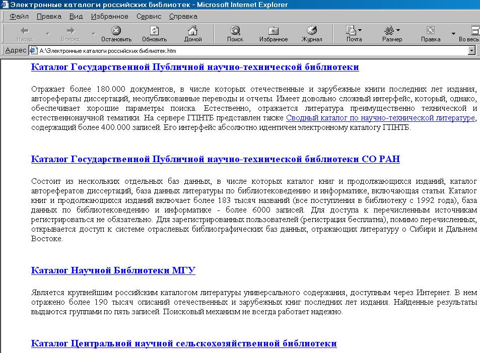 В описании каталога Государственной публичной научно-технической библиотеки есть ссылка на Сводный каталог по научно-технической литературе, который также служит указателем перехода. Щелкнув мышью по соответствующему фрагменту текста, мы переместимся на страницы этого сводного каталога. Таким образом, с помощью электронных страниц и гиперссылок в сети Интернет создан мощный электронный справочник, заменяющий много толстых книг, содержащих соответствующие библиотечные каталоги нескольких крупных библиотек. Причем поиск в этом справочнике вместо нас производит специальная поисковая система, которая работает во много тысяч раз быстрее и эффективней.