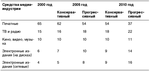 Прогрессивный сценарий отражает в таблице результаты, соответствующие существующим в развитых странах темпам развития составляющих медиа-индустрии. Консервативный сценарий подразумевает замедленное развитие перспективных средств медиа-индустрии, характерное для слаборазвитых и развивающихся стран. В целом, следует ожидать ускоренных темпов развития производства электронных изданий, в особенности мультимедийных и тех, для которых используются сетевые технологии распространения. Кстати, заметное снижение вклада печатных средств не означает абсолютного снижения производства печатной продукции. Вероятнее всего рост ее производства будет продолжаться (особенно это касается производства этикеток и упаковки), однако темпы этого роста будут постепенно снижаться.