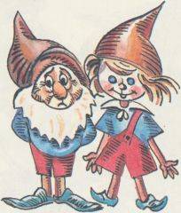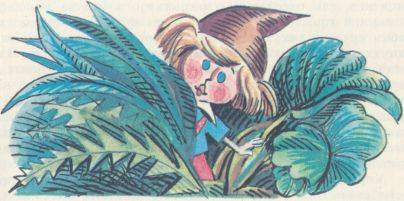 Элизабет набрела на дерево с большим выжженным дуплом, черным по краям. Дупло было таких размеров, что мамин лимузин вполне мог в него въехать и даже не поцарапался бы ничуть. Она стала вглядываться, но внутри было совершенно темно, и ей сделалось страшно. Так ничего и не увидев, она на цыпочках попыталась обойти дерево кругом. С другой стороны ствола был холм. На холме цвели красивые цветы — азалии, росли папоротник и щавель. А из листьев выглядывало чье-то малюсенькое личико. Оно было величиной с твой кулак (если только у тебя кулаки не очень большие) и могло бы оказаться мордочкой белки, или совы, или, наконец, медвежонка. Но ничего подобного: это было во всех отношениях человеческое лицо, только крошечное. С яркими румяными щечками, с крохотными голубыми глазками, с волосами пшеничного цвета. Над всем этим высился коричневый остроконечный колпачок. Это было явно испуганное личико. Элизабет замерла. Оба глядели друг на друга не отрываясь.