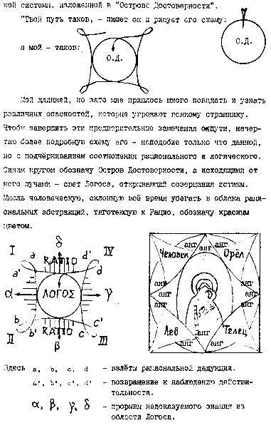 В ту зиму мы с Олегом изучали литургику, то есть поэзию и философию богослужебных текстов, иконописи и для этого ездили в староверские храмы у Рогожской заставы, где сохранялись древние иконы. Именно эти иконы навели Олега на мысль о царстве небесном как о радостном сосуществовании тварей, а не только как о совершенном устроении человеческой души. На иконах Воскресения и Преображения мы прочли веру наших отцов в то, что и растения, и животные, а не одни только люди, сохраняются для вечности в замысле о них Творца. На иконе «Неопалимая купина» Олег прочел схему своей философской системы, изложенной в «Острове Достоверности». «Твой путь таков, — пишет он и рисует его схему, — а мой — таков (см. рис.). Мой [путь] длинней, но зато мне пришлось много повидать и узнать различных опасностей, которые угрожают всякому страннику». И дальше продолжает: «Мое исследование разбивается на четыре больших размышления. Их можно озаглавить так: