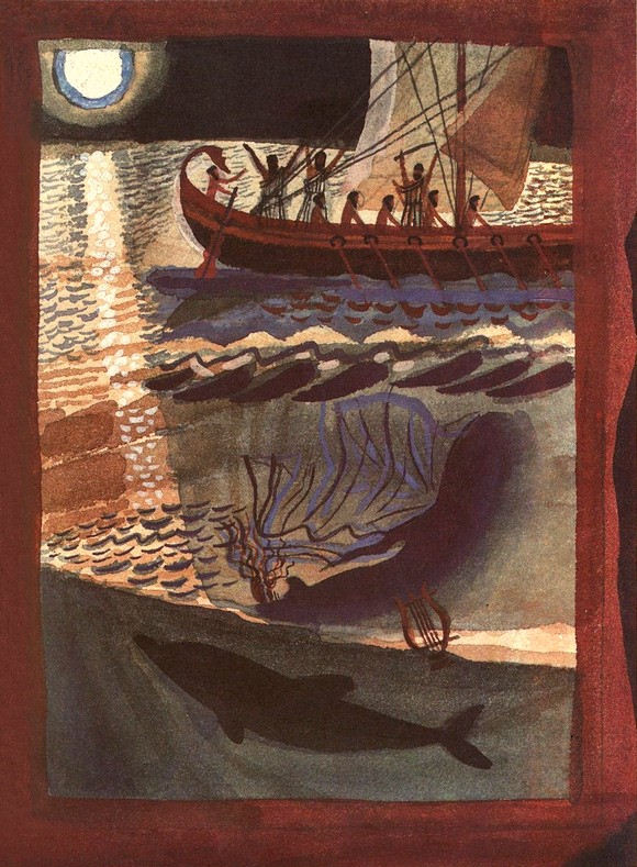Арион поднялся на нос корабля, лёгкими пальцами коснулся струн и запел. Он пел о прекрасной земле, которую не увидит больше, об огненном небесном колесе, тепло и свет которого не коснётся больше его щёк… Песня звенела над спящим морем. Вдруг рядом с парусником появился кто-то большой: это дельфин Варра-Вар приплыл послушать чудесный голос человека. Но песня оборвалась на середине: Арион бросился с корабля и исчез в волнах. Моряки ещё некоторое время видели его белую одежду, но вскоре ничего уже нельзя было различить в темноте.