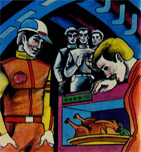 — Дай-ка я. — Андрей отстранил смущённого пилота. Друзья шумно зааплодировали: в синтезаторе, секунду назад ещё пустом, теперь на большом блюде лежал, воздев кверху косточки мясистых ножек и дымя восхитительно-золотистой корочкой, жареный гусь.