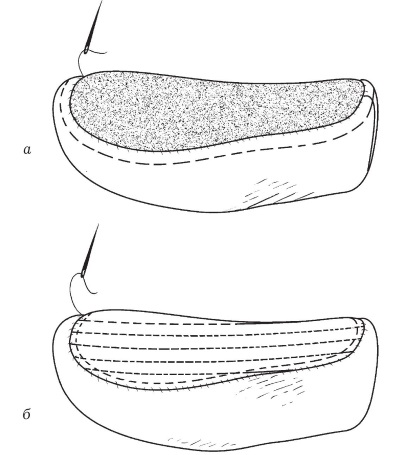 а – закрепление припусков на швы; б – притачивание подошвы из фланелевой ткани