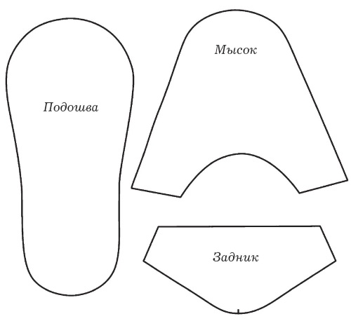 Если верхняя часть изделия выполняется из кожи или войлока, достаточно выкроить по 2 детали верха для каждого тапочка (не забудьте, что вторые детали выкраиваются в зеркальном отображении), сложить их изнаночными сторонами внутрь и стачать центральные срезы.