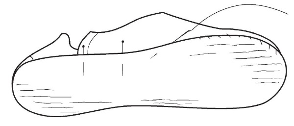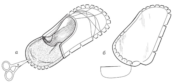Припуски на швы надсечь на закругляющихся участках. Подошвы вывернуть на лицевую сторону.