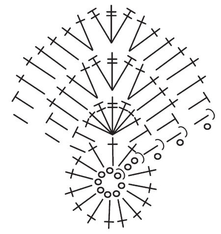 В 13-м ряду выполнить 2 столбика без накида в 1 петлю, столбики без накида в следующие 11 петель, 2 столбика без накида в следующую петлю, столбики без накида в следующие 9 петель, 1 столбик без накида в 1-й столбик ряда (всего 24 петли).