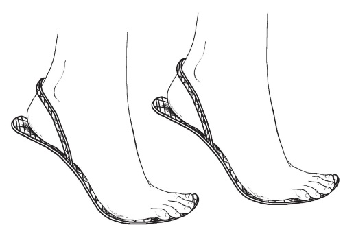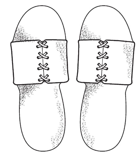 Отрезки подтяжек протянуть через прорези 3 выступов в задней части сандалий, формируя задние ремешки. Концы ремешков закрепить пряжками.