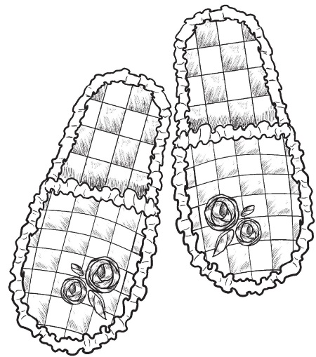 С изнаночной стороны плетеных деталей верха приметать соответствующие детали из хлопчатобумажной или атласной ткани лицевыми сторонами наружу, одновременно вметывая оборку по верхнему краю тапочек. Выполнить по наметке машинную строчку.