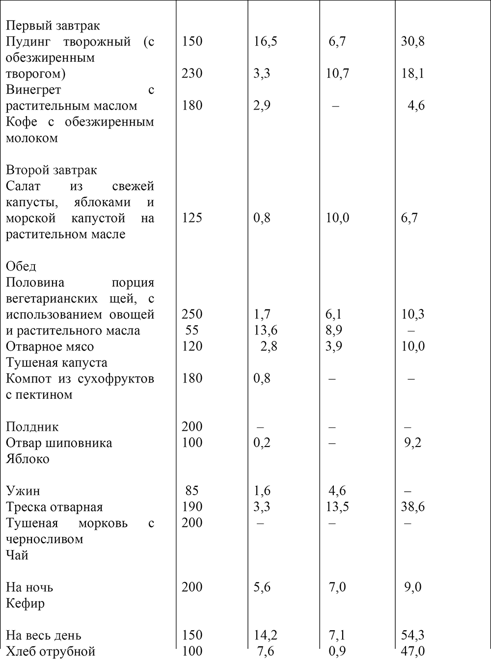 Примерное однодневное меню для больных ИБС с избыточной массой тела уложилось в 2165 ккал. Из приведенных данных видно, что в лечебной диете, показанной при ишемической болезни сердца, количество белков, жиров и углеводов представлено несколько ниже, чем в рекомендациях по рациональному питанию. Однако количество углеводов в ней значительно выше, чем это рекомендуется в кремлевской диете.