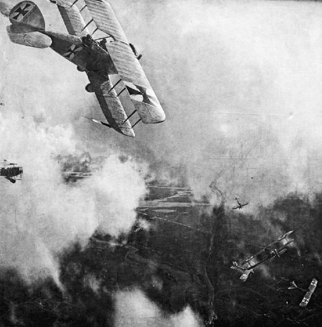 За годы войны необычайно развилась авиация. Сначала самолеты использовались для наблюдения и разведки, потом французы первыми установили на них пулеметы. Работавший на немцев голландец Антон Фоккер предложил конструкцию, при которой пулемет стрелял через пропеллер. С появлением истребителей возникла концепция воздушного боя, и пилоты-храбрецы, асы, обрели известность по обе стороны фронта. Одним из самых прославленных асов был немец Манфред фон Рихтгофен по прозвищу Красный Барон. Рихтгофен, расправившийся с 80 самолетами противника, погиб в воздушном бою в апреле 1918 г.