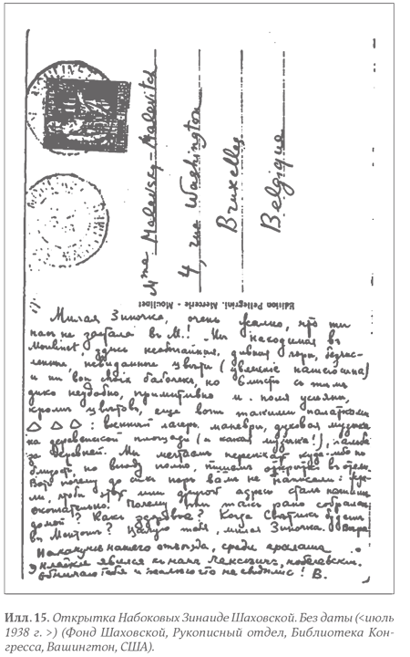 Владимир Набоков – Зинаиде Шаховской, не датировано (1938 г.), открытка (Фонд Зинаиды Шаховской, Рукописный отдел, Библиотека Конгресса, Вашингтон, США).