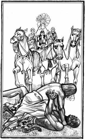 Но тут стоящая передо мной толпа, превратившись в густую, плотную массу, пришла в движение, загородив от меня улицу, и я, охваченный волнением, перепрыгнул через ограду помоста и стал проталкиваться – благо, силы и ловкости у меня хватало – вперед, пока не очутился в первом ряду, рядом с самой дорогой. И как только я там оказался, на улицу выбежали нубийские рабы в венках из плюща на головах и с толстыми палицами, раздавая удары по теснившимся людям направо и налево. Один из них мне сразу бросился в глаза: это был настоящий великан. Уверенный в своей могучей силе, он, наглец, которому неожиданно дали власть, был особенно свиреп – избивал людей без всякой причины. Так ведут себя самые гнусные хамы. Рядом со мной стояла женщина, по виду египтянка, с младенцем на руках, и этот великан, увидев, насколько она слаба и беззащитна, ударил ее по голове своей палицей, отчего та, не издав ни звука, упала. Толпа зароптала. У меня же кровь бросилась в голову и помутила рассудок. Я держал в руке жезл из кипрского оливкового дерева, и когда чернокожий негодяй захохотал над рухнувшей женщиной, корчившейся на земле от боли, и над ее беспомощным ребенком, я в бешенстве размахнулся и ударил его жезлом изо всей силы. Я вложил в удар всю свою ярость, и он оказался так силен, что крепкая палка переломилась о плечи великана, и хлынувшая кровь, брызнув, окропила его венец из листьев плюща.