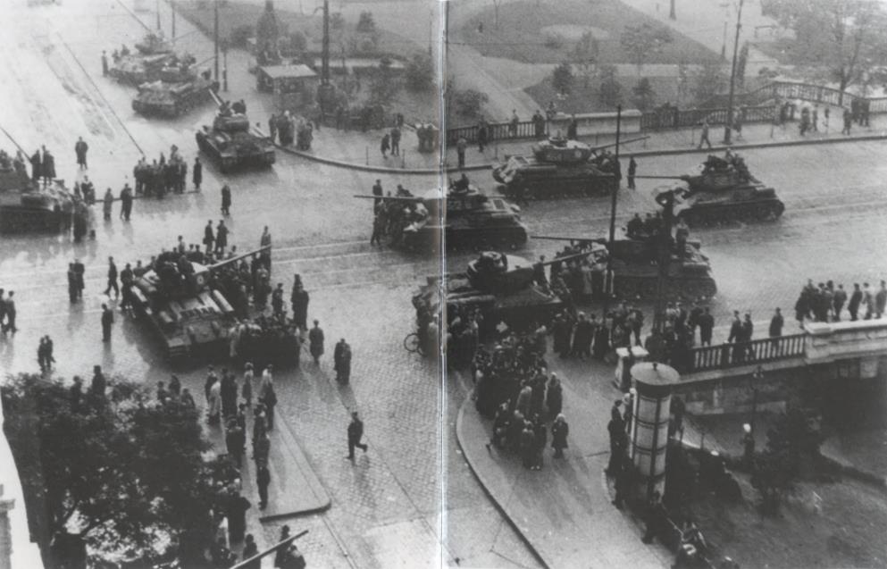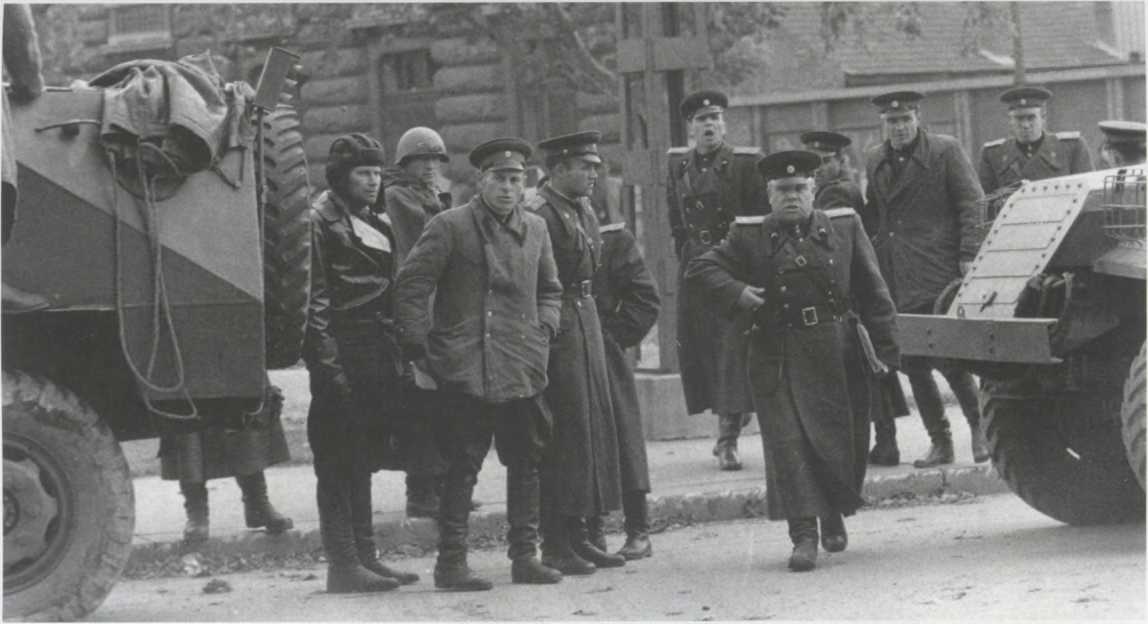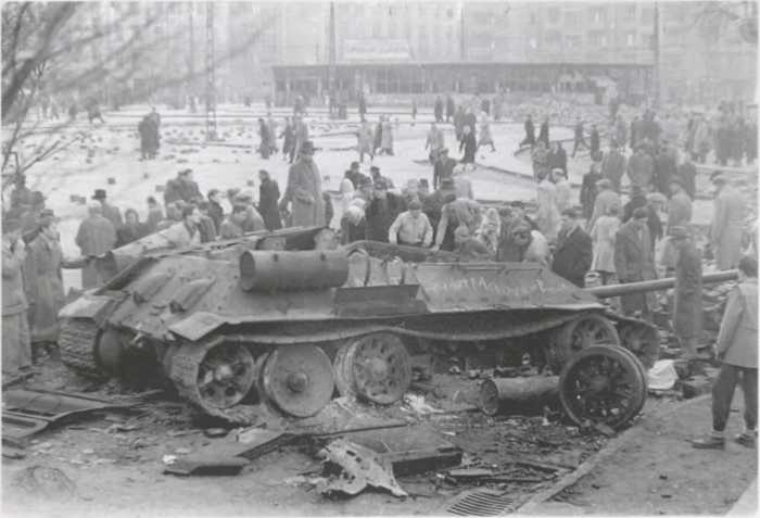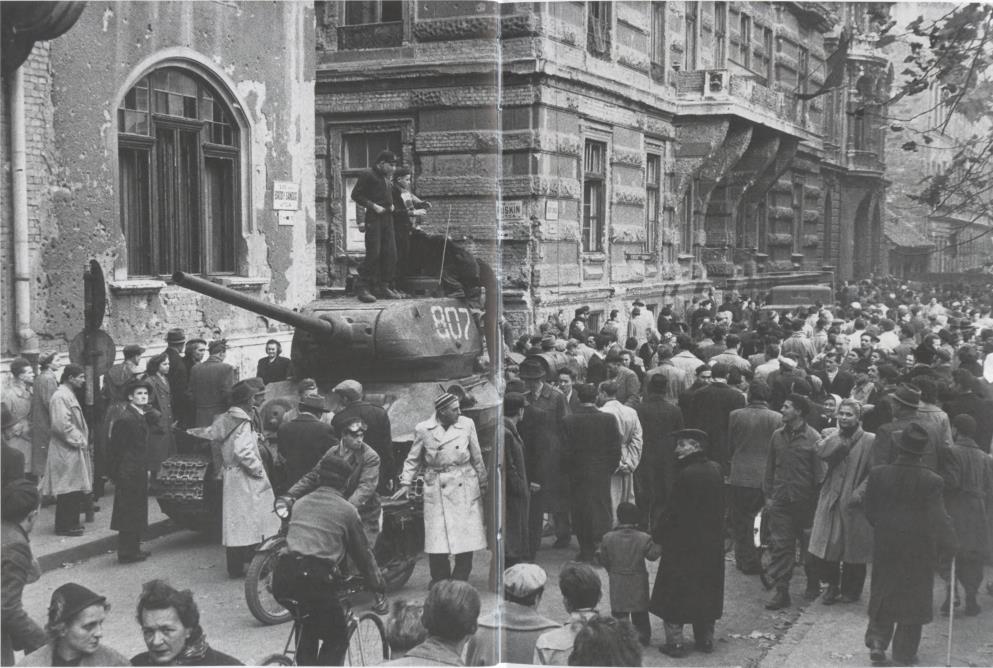 Советские танки Т-34-85 расположились в одной из стратегически важных точек в центре Будапешта 5 ноября 1956 г. 29 октября бои на улицах города прекратились; 30 октября на президиуме ЦК КПСС вожди Советского Союза приняли решение вывести все советские части из Будапешта, и утром советские войска начали покидать город. Казалось, революция победила, однако, к несчастью, события в Венгрии совпали по времени с Суэцким кризисом: 29 октября Израиль, а затем и члены НАТО Великобритания и Франция напали на поддерживаемый СССР Египет с целью захвата Суэцкого канала. 31 октября руководство СССР приняло решение провести военную операцию «Вихрь» с целью свержения революционного правительства Венгрии, и утром 4 ноября начался ввод в Венгрию новых советских воинских частей под командованием маршала Конева.