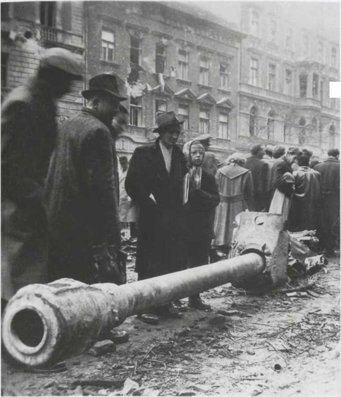 Жители Будапешта возле орудия подорванного советского танка (конец октября - начало ноября 1956 г.).