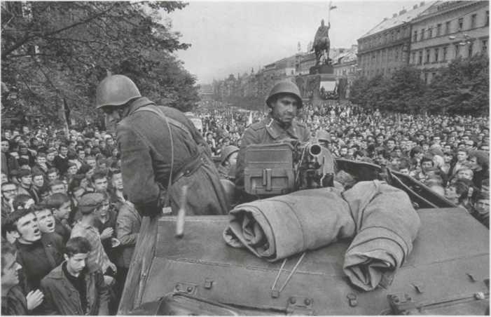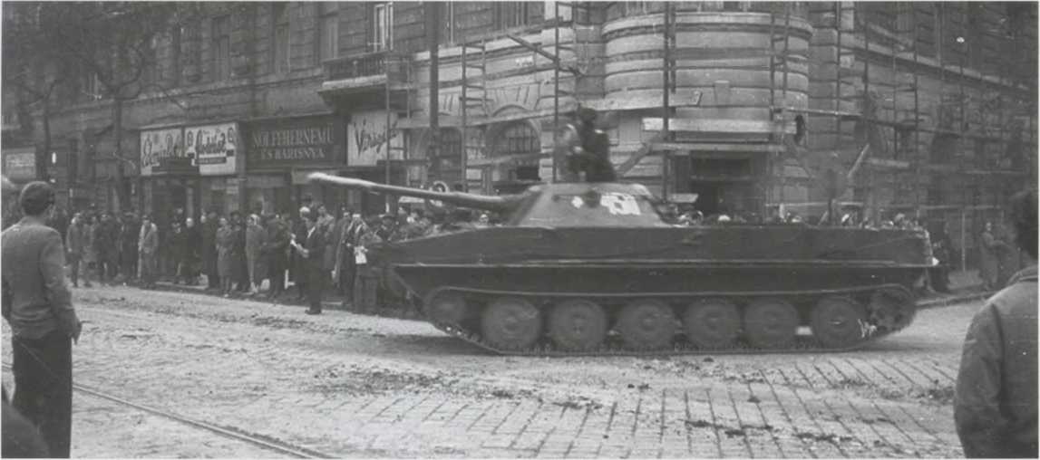 Советский легкий плавающий танк ПТ-76 на улицах Будапешта (конец октября - начало ноября 1956 г.). Танк ПТ-76 вполне соответствовал требованиям грядущего освободительного похода в Европу: его броня частично спасала экипаж от радиации, гусеницы позволяли не обращать внимания на окопы и траншеи, водные преграды плавающему танку нипочем — ведь путь советским «освободителям» будут преграждать не только войска угнетателей трудового народа, но и естественные препятствия, прежде всего реки. Поэтому разведывательные роты мотострелковых и танковых полков и разведывательные батальоны мотострелковых и танковых дивизий имели на вооружении плавающие танки ПТ-76, а мотострелковые подразделения танковых дивизий имели на вооружении плавающий гусеничный бронетранспортер БТР-50П, созданный на базе танка ПТ-76. Этим машинам никакой Рейн был не страшен.