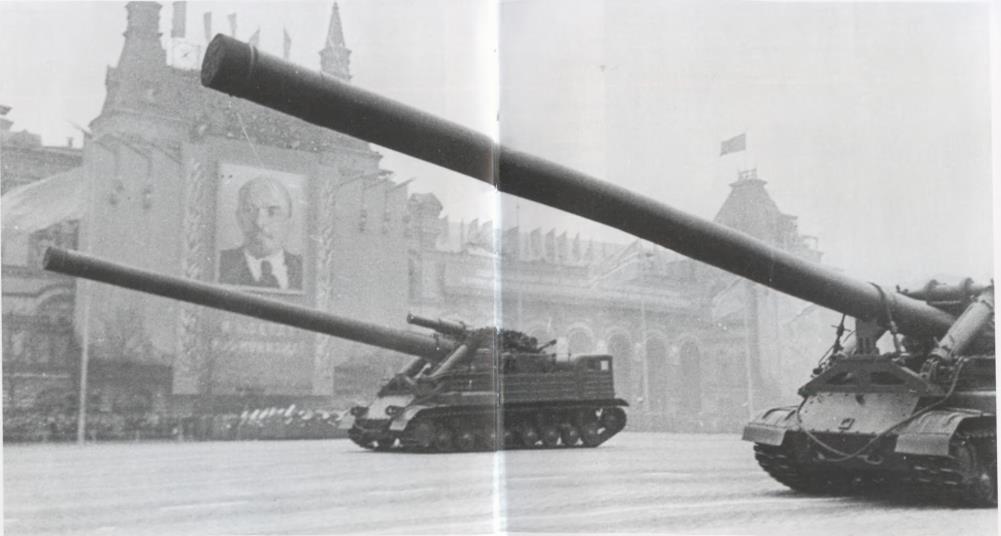 18 ноября 1955 г. Совет Министров СССР принял постановление о начале разработки средств доставки тактического ядерного оружия, с помощью которых войска смогли бы наносить ядерные удары в непосредственной близости от своего расположения. Первым направлением работы было создание самоходной пушки калибра 406 мм и ядерного снаряда для нее. За основу взяли советское корабельное орудие типа Б-37, которым ранее планировалось вооружать линкоры типа «Советский Союз», а базой для создания самоходного лафета стал танк Т-10М. Снаряды весом 570 килограммов эта пушка могла швырять на 25 км. Вторым направлением была разработка на той же базе самоходного миномета 2Б1 калибра 420 мм, который мог бросать мины весом 670 килограммов на 25 км, активно-реактивные мины — на 50 км. Было выпущено по 4 опытных экземпляра каждого из орудий; они приняли участие в параде на Красной площади и произвели настоящий фурор: теперь все видели, что у Советской Армии есть чем проломить фронт супостата.