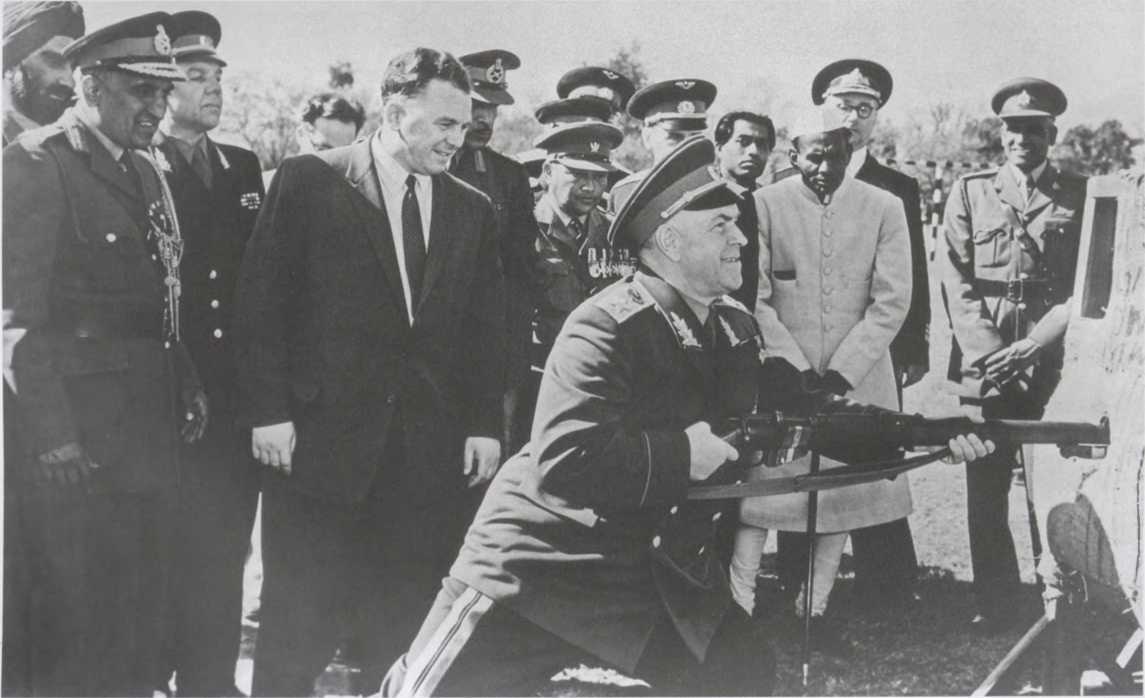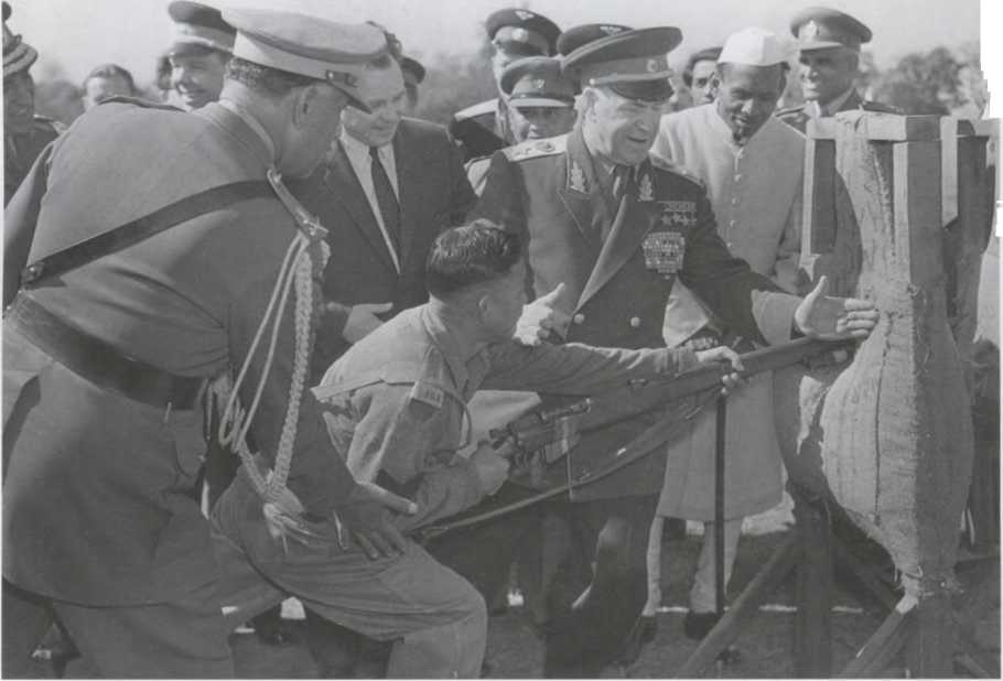 Георгий Жуков показывает приемы штыкового боя индийским военным во время визита советской военной делегации в Индию 5 сентября 1957 г. Генерал-лейтенант Пётр Полях вспоминает, что одним из результатов визита Жукова в Индию (где офицеры регулярно занимались спортом и выглядели очень подтянутыми), было введение в Советской Армии «индийского часа»: шесть дней в неделю в частях среди офицеров проводились часовые занятия по строевой, физической и стрелковой подготовке. После снятия Жукова с должности министра обороны «индийский час» сразу же отменили.