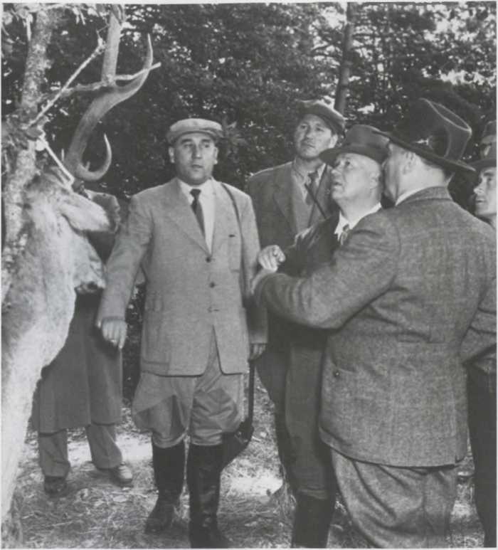 Никита Хрущёв (в центре) и президент Югославии маршал Йосип Броз Тито (справа, стоит спиной) осматривают охотничий трофей (1956 г.). Несмотря на восстановление при Хрущёве советско-югославских отношений, Союз коммунистов Югославии во главе с Тито и успешно противостоял идеологическому и политическому давлению СССР и отстаивал собственную модель развития социалистического общества, хотя Тито одобрил вторжение советских войск в Венгрию в 1956 году.