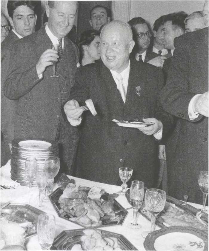 Новое лицо советского коммунизма. Первый секретарь ЦК КПСС Никита Хрущёв приветливо улыбается на приеме во французском посольстве по случаю визита в Москву премьер-министра Франции Ги Молле 5 июня 1956 года. Ушли в прошлое те времена, когда редкая улыбка, на мгновение появлявшаяся на устах Сталина или Молотова, немедленно становилась событием мирового значения, и теперь жители западных стран с изумлением смотрели на новых вождей Советского Союза, источавших добродушие и сердечность.