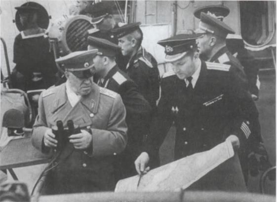 Министр обороны СССР Жуков на капитанском мостике крейсера «Куйбышев» на пути в Югославию (4-7 октября 1957 г.).