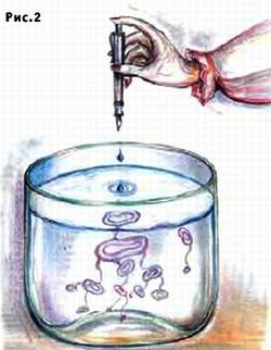 Старайтесь добиться, чтобы капля была как можно меньше. Вы увидите, как на поверхности воды после падения капли сразу же образуется круговое кольцо — вихрь, из него начнут опускаться смерчики (обычно 4–6 штук), на конце каждого из них образуется колечко-вихрь, которое также выпустит смерчики, далее снова и так далее, обычно 5–6 делений. У этих вихрей кольцевого движения незаметно. Зато есть ярко выраженное тороидальное.