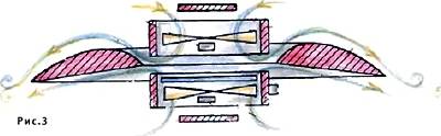 По-видимому, в обоих случаях кольцевое крыло выполняет основную роль. Но работает оно здесь в иных условиях, чем на самолете. Поток воздуха, обтекающий крыло летательного аппарата Иванова, расширяясь по мере своего движения, замедляет свою скорость возле задней кромки крыла. У аппарата Воронова, наоборот, скорость воздуха по мере уменьшения поперечного сечения потока возрастает.