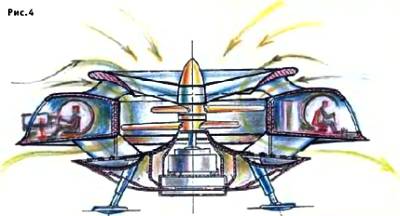 Очевидно, вихревые аппараты Э.Натанова можно разместить и на дискообразном крыле. Изменяя соотношение создаваемых ими подъемных сил, можно добиться наклона аппарата и получить горизонтальную тягу. Изображением такого псевдо-НЛО (рис. 7) мы и завершаем наш рассказ.