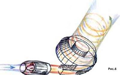 Но в изобретении Натанова все иначе. Подъемная сила создается потоком воздуха, направленным вверх. Значит, реактивная тяга уже ни при чем. Поток использован необычный. По существу, это смерч, полученный в специальном вихревом аппарате. Его устройство ясно из рисунка 6.
