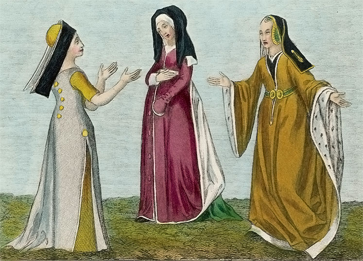 В период Средневековья женщины носили киртл (похожий на нижнее платье), котарди (предмет верхней одежды с корсажем), не сшитое по бокам сюрко (напоминавшее жакет) и упелянд (он же – верхнее платье). Но вдруг в середине 1300-х годов силуэт резко изменился. Как пишет Джеймс Лейвер, во времена правления Филиппа Валуа во Франции мужские длинные туники вышли из моды, уступив место более коротким скроенным предметам одежды и облегающим чулкам (15). Что касается женской одежды, примерно с 1360 года «началось зарождение того, что мы считаем модой: быстрой смены различных фасонов».